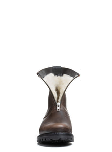 I bought the men’s boots because I have a wider foot and the men’s come in an E width. I can even wear a thick merino sock and the boots do not feel too tight! I love the wool lining which makes the inside very comfortable and warm. The front zipper is also convenient as well as stylish, and I like the leather waterproofing for the winter. The leather is soft and I’m sure will patina beautifully. I look forward to wearing these boots for many years!