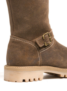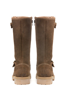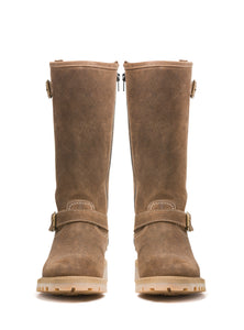 Voici SIERRA, l’un des huit nouveaux modèles de notre collection féminine réimaginée, reflet discret de notre nouvelle direction artistique. Cette botte d’hiver à tige haute incarne une élégance enracinée, où la simplicité sculpturale rencontre l’esprit alpin. Confectionnée en suède de veau et doublée de véritable peau de mouton, elle offre une chaleur enveloppante à chaque pas. Sa semelle style crêpe et ses surpiqûres ton sur ton adoucissent sa structure robuste, tandis que ses boucles en laiton vieilli évoquent un charme intemporel. Dans une teinte miel chaleureuse, SIERRA marie la grâce à la fonctionnalité. Conçue pour la femme qui traverse l’hiver avec intention et beauté.
