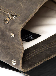Conçu en cuir véritable pleine fleur imperméable, le sac à dos Anfibio allie robustesse et style discret. Son extérieur couleur Rock offre une poignée supérieure en cuir roulé, des bretelles ajustables en cuir noir avec quincaillerie en D, et une poche frontale zippée YKK de 8 pouces pour un accès rapide.